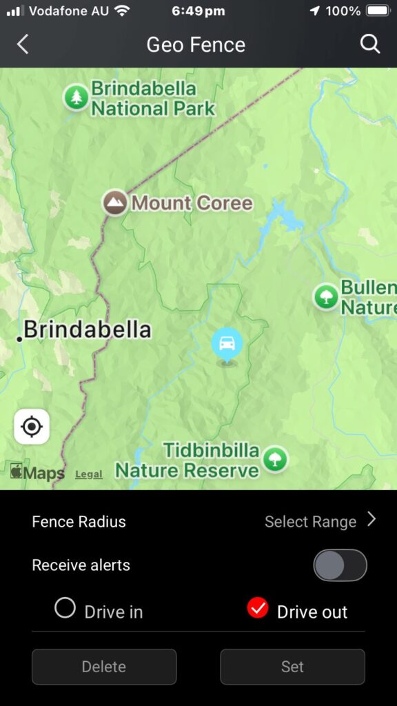 Some people in other countries seem to have had similar issues. Some of them fixed it by clearing the app cache, reinstalling the app or even by disconnecting the battery of the car for a while. Tried all that, it hasn’t worked. The battery idea makes some sense. The car is apparently connected via Vodafone, which is the same as my phone. If I travel too far from home, I occasionally have to turn the phone off and on to get data working again. I suspect the car did connect at some point, although not with a good GPS reading. The Geo Fence app shows the car in a creek in a nature reserve, which while obviously wrong is not too far from home and not where the car originally came from.